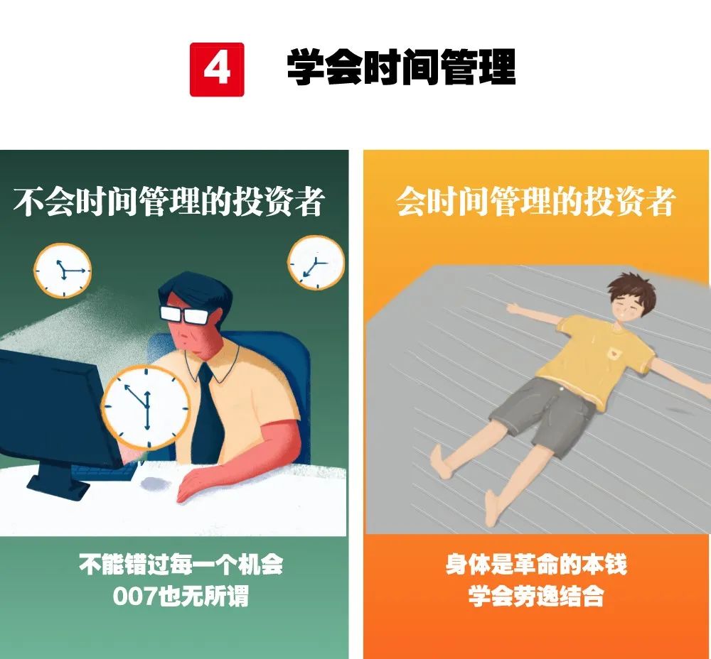 期货新手:不能错过每一个机会,007也无所谓成熟的期货投资者:身体是革命的本钱,要会劳逸结合 做任何事都讲究劳逸结合,期货投资也不例外。 索罗斯曾经说过,"休息其实是工作的一部分,只有远离市场,才能更加清晰地看透市场。那些每天都守在市场的人,最终会被市场中出现的每一个细微的波动所左右,最终根本就失去了自己的方向,被市场给愚弄了。" 一名成熟的期货投资者,不会把时间100%花在交易上,他们会合理安排时间,只在看好的机会进场,并设置好出场点以及止损点。他们更多的时间会花在养精蓄锐,以及提升交易盈利率上。 投资市场里,一个人的修养会支配着他的行为。市场交易一买一卖,隐含着投资者修养,也反映出投机者的价值观、金钱观。因此,期货投资者在期货市场的最终命运,深层原因取决于一个投资者的自我修养。