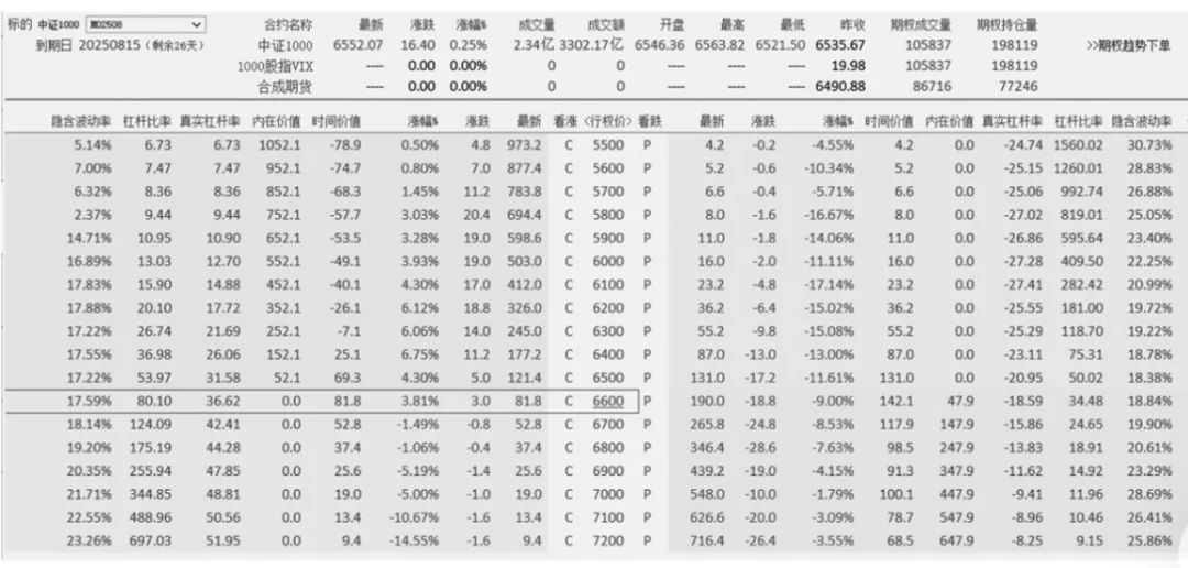 下面通过一个案例来介绍期权的杠杆倍数。下图是2025年7月20日中证1000股指期权的T型报价图。
