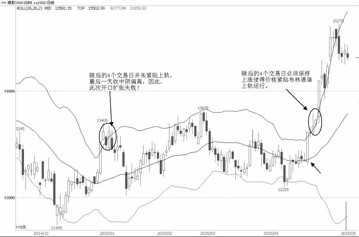 首先,布林通道开口扩散时的价格变化必须够大;其次,当时所产生的K线必须是大阳K线或大阴K线;最后,随后的4个交易日期 货价格必须继续“紧贴”布林通道上轨运行。如沪胶在2014年12月30日和2015年4月21日均出现了布林通道开口放大迹象 ,同时当日的价格波动也非常大(均以涨幅4%以上的大阳K线收盘),但最后一个条件——随后4个交易日必须持续紧贴布林通道 上轨运行却有差异。前者在第四个交易日(2015年1月7日)出现中阴K线,价格脱离布林通上轨而不再“紧贴”,而后者在随后的第4个交易日(2015年4月27日)却继续收出大阳K线(当日收于涨停板),“紧贴”甚至上穿布林通道上轨。那么,最后一个条件只有后者符合,因此后者的上涨行情得以确认和延续。而前者未出现最后一个条件,因此波段性上涨行情未出现,期货价格继 续陷入振荡之中。