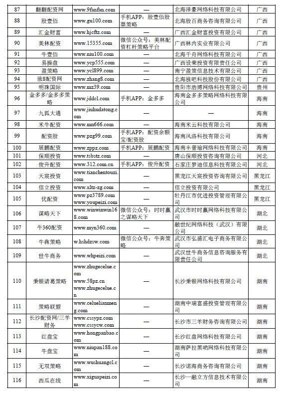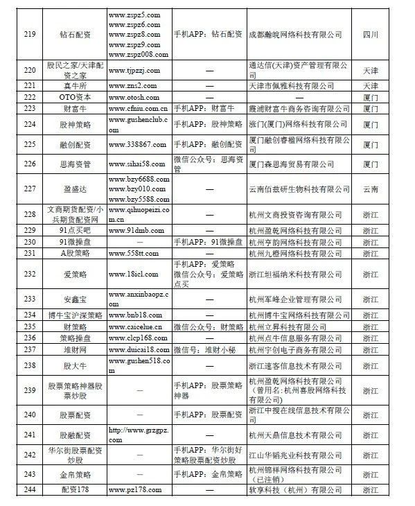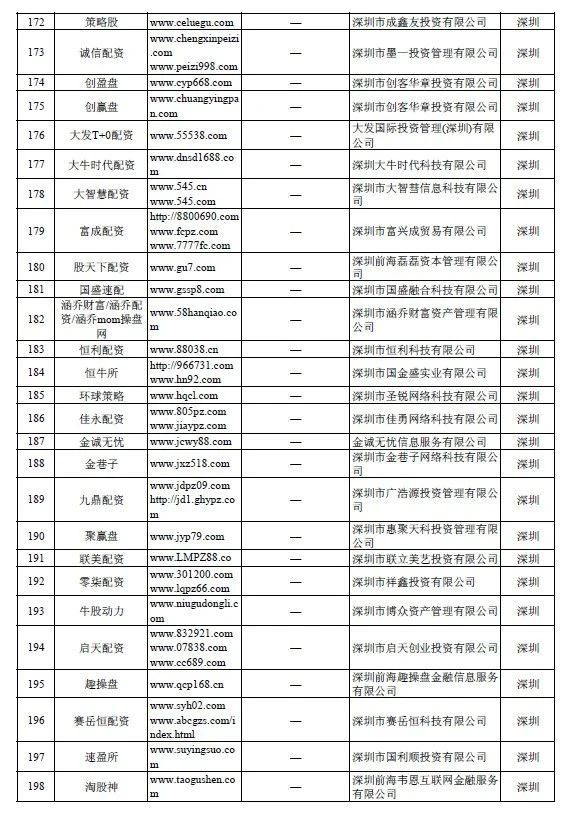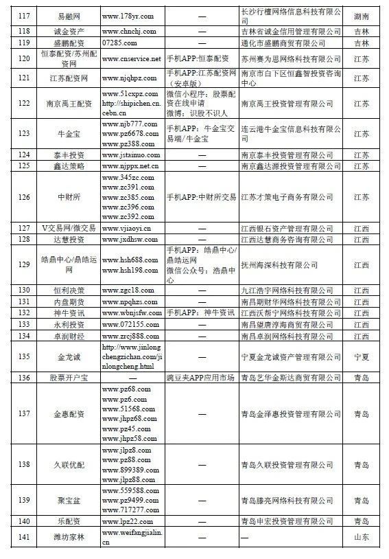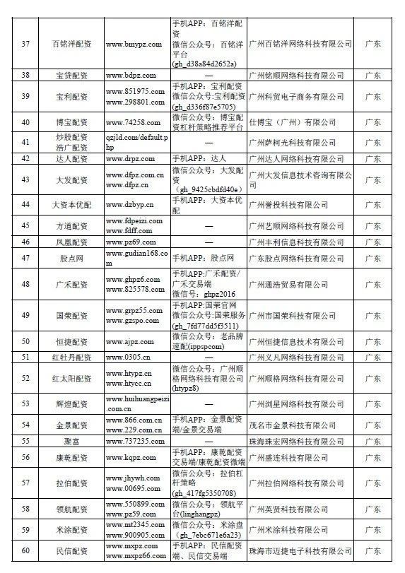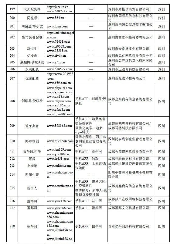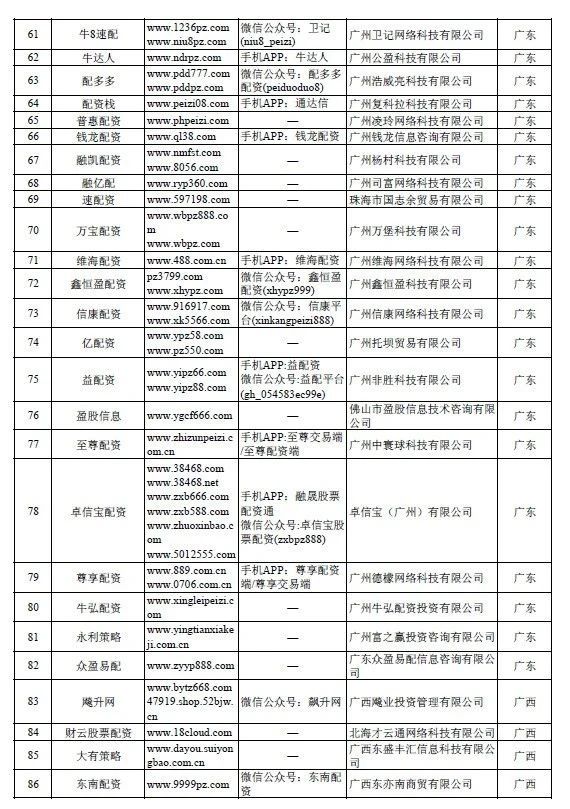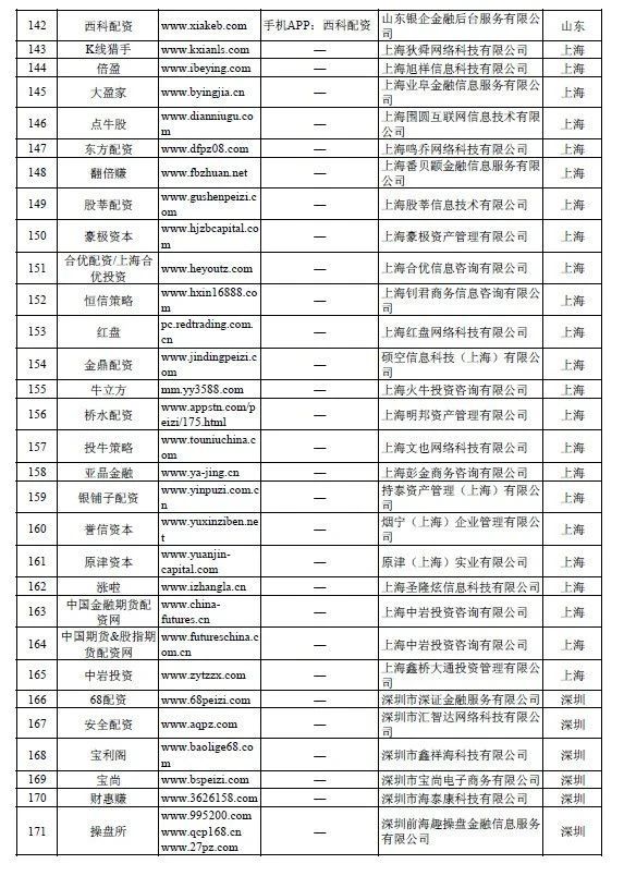 目前,一些不法机构或个人创建场外配资网站、手机APP、微信公众号等平台,宣称提供最高十余倍的炒股资金,以“您炒股、我出钱”“杠杆炒股、盈利高”“实盘交易、门槛低”“资金安全、提现快”等为噱头,诱导投资者参与场外配资活动。近日,各地证监局曝光了一批场外配资平台,经汇总整理,现将258家非法从事场外配资的平台及其运营机构名单予以集中曝光。