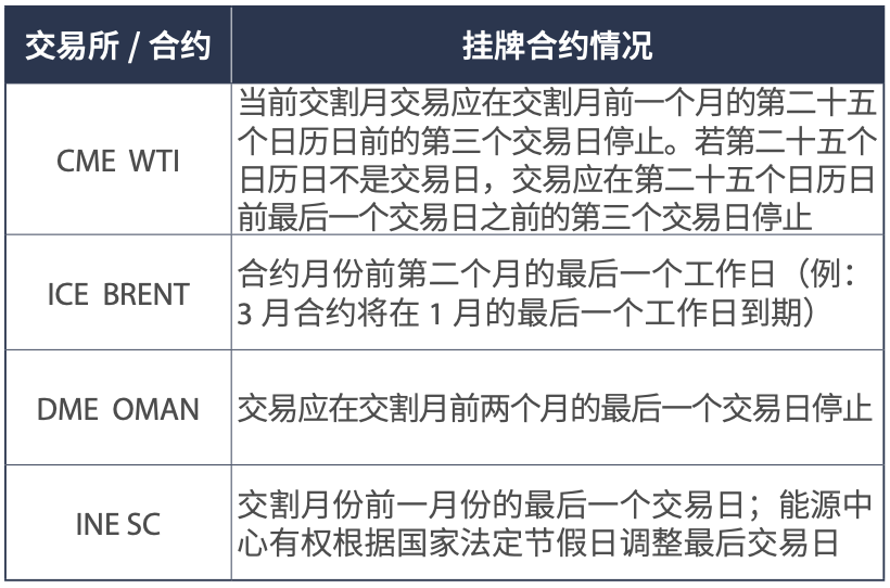 我国原油期货挂牌合约拟定为36个月以内的合约,其中最近1-12个月为连续月份合约,12个月以后为季月合约。国外成熟原油期货市场的挂牌月份一般较长。布伦特原油期货挂牌合约为96个连续月份。WTI原油期货挂牌本年和未来10年的月度合约,以及2个额外的连续月份合约。在本年12月合约交易终止后,上市新一年的月度合约和2个额外的连续月度合约。迪拜商品交易所阿曼原油期货合约的挂牌月份为交易当年及其后5年月份挂牌。当年12月合约交易终止后,将新增一个日历年。