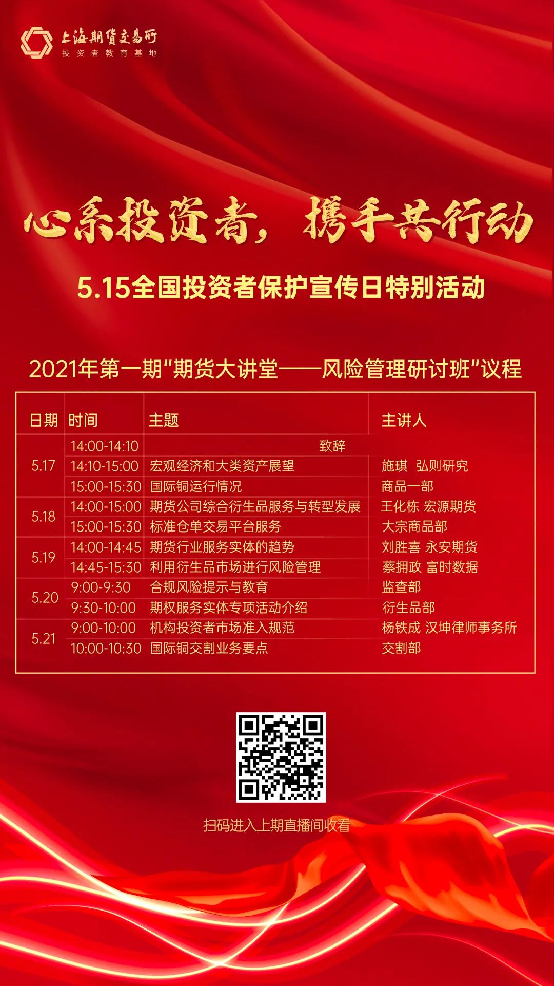 在第三届5.15全国投资者保护宣传日来临之际,为服务投资者,为群众办实事,上期所将于5月17-21日举办2021年第一期“期货大讲堂-风险管理研讨班暨全国投资者保护宣传日特别活动”,邀请有关宏观研究、期现综合服务、制度法规、实体企业等领域的专家,及上期所业务部门代表,针对市场形势、品种业务、市场监管、企业应用案例等进行讲授,每日一期,欢迎广大投资者线上收看!