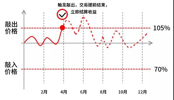 损益情形二、先触发敲入事件,后触发敲出事件。假设在第1个月的某个交易日,中证500指数下跌至4870点,低于4900点的敲入价格,触发敲入事件。随后,中证500指数触底上涨,在第6个月的观察日时,中证500指数大幅涨至7360点,超过7350点的敲出价格,触发敲出事件,此时产品提前结束。投资者共持有产品6个月,获得1000000*18%*(6/12)=90000元的收益。如下图所示: