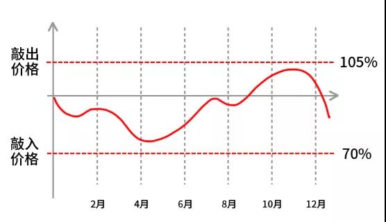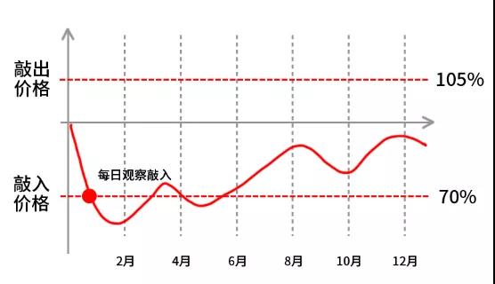 损益情形三、未触发敲入和敲出事件。假设在产品持有期的12个月内,中证500指数在5200点和7200点之间震荡,均没有触发敲入事件(低于4900点)和敲出事件(高于7350点),那么产品满12月后到期结束。投资者共持有产品12个月,获得1000000*18%=180000元的收益。如下图所示: