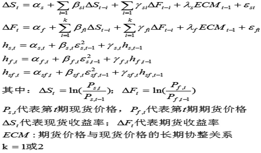 如前所述,各类动态、静态模型在估计最优套期保值比率过程中各有利弊,从而萌发了将二者结合起来应用的设想,以便综合各种方法的优势,达到更佳的套期保值效果。最具代表性的结合是误差修正模型与广义自回归条件异方差模型的联合应用,即ECM—GARCH模型,该模型即考虑了期现价格间的协整关系,又考虑了金融时间序列的异方差特征,进一步改进了套期保值的效果。综合分析对比了当前各类套期保值比率的估计方法,个人认为应该引入VECM—GARCH模型,即向量误差修正模型与广义自回归条件异方差模型的结合,因为该模型比ECM—GARCH模型多考虑了期现市场的相互作用,套期保值效果也必将得到改善,而且运用的原理和方法比一些动态模型要简单,容易操作。