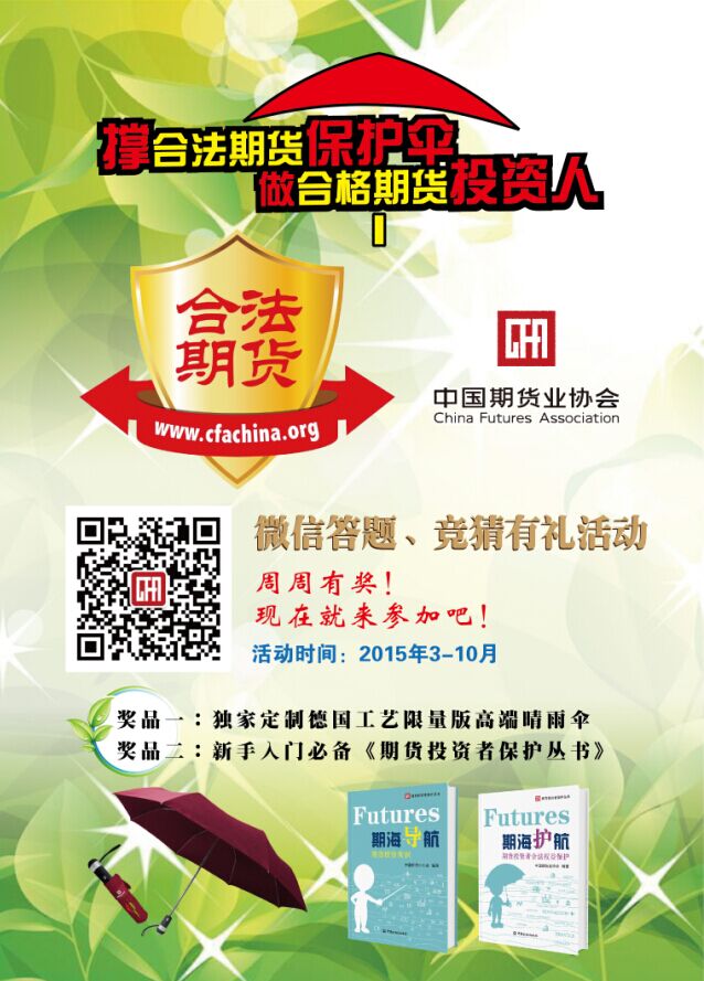 为深入贯彻《关于进一步加强期货经营机构创新发展的若干意见》有关投资者保护的指示精神,推动会员单位加强投资者教育工作,开展内容丰富、投资者喜闻乐见的投教活动,中国期货业协会决定开展“撑合法期货保护伞、做合格期货投资人”微信有奖答题活动。