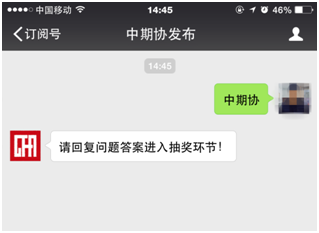 第一步:参与者打开微信答题页面查看题目。回到公众号,先输入推荐机构(中期协会员单位)简称(如推荐单位非中期协会员单位或无单位,可填写“中期协”);填写匹配,系统会自动给出提示:“请回复问题答案进入抽奖环节!”,之后按答题顺序依次输入三个字母选项答案,大小写均可;