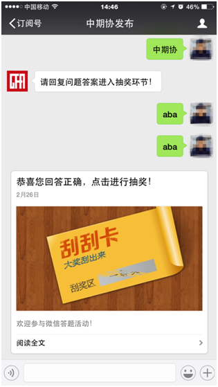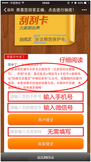 第三步:中奖者需按中奖页面提示填写手机、微信号等个人信息,并按“中奖:真实姓名+微信号+手机号+邮寄地址”的格式回复至“中期协发布”公众号,未按该格式的视为无效。