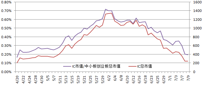 数据显示,自IC上市以来,持仓最高为6万手左右,持仓市值最高仅为1300亿,而相应的中证500市值(中小板和创业板)为19.5万亿,IC持仓市值约占中证500指数总市值的比一直维持在0.1%-0.72%之间。