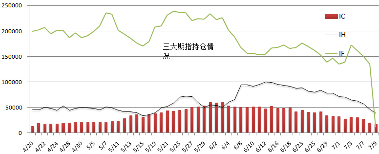 2、于是将恶意做空A股矛头指向中证500。最流行说法,通过中证500期指恶意做空A股,依据是大幅贴水和IC1507合约在6月19日前后持仓大幅增加。对于后者,我们认为,相关人士缺乏对期指基础知识的了解,IC1507合约急剧增加为移仓换月所致,每到第三周移仓换月前后均出现该类现象。从三大期指综合持仓看,危机爆发以来持仓总量是下降的(如图3)。IH持仓增加缘于风格转化,分流IF持仓所致。因此,从持仓来看,危机前后至限仓措施出台前,未出现异常增仓行为,所谓的恶意做空缺乏数据支持。
