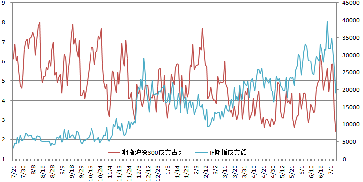 (1)危机前后,IF市值与现货指数市值比未见异常。从持仓市值看,自去年7月21日本轮牛市以来,IF期指持仓价值占到整个沪深300指数成份股总市值的0.6%-1.1%之间。伴随沪深300指数的上升,规避风险需求在增加,使得IF持仓市值有所增加,去年12月份达到高点,之后处在高位震荡阶段。但值得注意的是,在危机前后IF持仓市值并未呈现异常现象。(6月底以来大幅下降,主要中金所限仓所致)