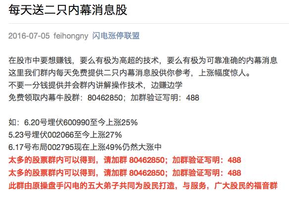 上述五个分类中,以第五类违规信息最为集中,有149家,可能与开设博客、QQ几乎没有门槛,成本较低有一定关系。这些违规机构的名称也很“狗血”,什么“股预言帝”“每天送二只内幕消息股”“股票拜师群”,简直不能再简单粗暴了,再来感受下这些荐股页面的画风:
