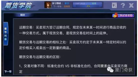 如金融基础版块,可以学到关于股票、期货、基金、外汇等大金融范围的各种相关知识。学习完后,点击右上角的【测试拿奖励】还可以对知识进行回顾和巩固。