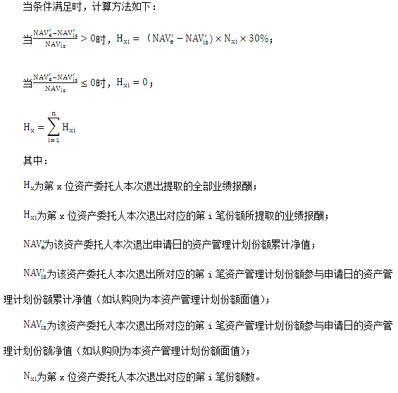 当资产委托人退出对应份额持有期间的收益高于0%(不含),提取该对应份额收益的30%作为业绩报酬。