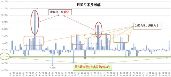 更为重要的是,历经多年沉淀,在交易风控上更加熟稔,是在风险可控前提下赚取收益的。一方面,把握趋势,在顺势时敢重仓,最大化博取收益;另一方面,通过“多策略、多周期”等多种手段和途径,将风险控制最合理范围内。一般而言,在产品初期夯实安全垫前提下逐步提升风险可承受能力,并且,尽量将每日最大风险控制在2%以内。换句话说,通过在风控上优势,将具有“高风险、高收益”产品的特性,转化为“高收益、中低风险”,以增强其产品适用范围。