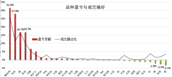 虽瑞达28号以趋势性交易为主,但施行的是“广撒网多收鱼”的策略,交易品种多达31个,基本上覆盖全部活跃品种。从交易结果来看,前四大盈利品种分别为螺纹、焦炭、镍和原油,盈利总和高达92%,可谓是切中热点品种;而亏损的四大交易品种为铜、焦煤、棉等,亏损的拖累不到10%,这也体现“盈利集中、亏损分散”的特性。