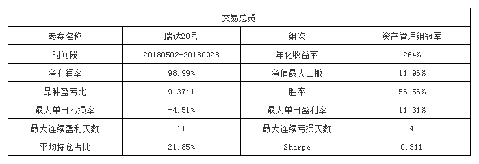 2018年,瑞达28号历时四个半月(5.10 - 9.28日),以稳步向上态势,最终以净利润率99%(净值变化率92.5%),即年化净利润率率为264%,录得该组冠军。
