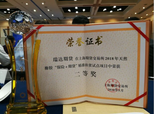 据介绍,瑞达期货已连续两年参与上期所的天胶“保险+期货”精准扶贫试点项目工作,试点地址均在云南省西双版纳。2018年因为精准扶贫试点项目的突出表现,瑞达期货获评上期所天然橡胶“保险+期货”精准扶贫试点项目二等奖。