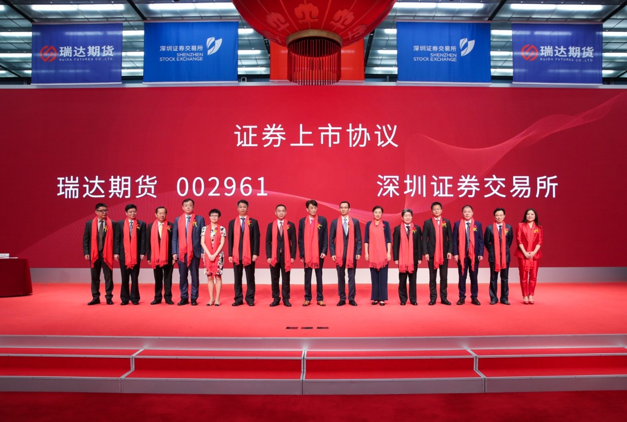 厦门市政府副市长李辉跃、厦门市思明区政府常务副区长吴旗荣、中信证券高管、投行管理委员会委员、董事总经理孙毅、瑞达期货股份有限公司董事长林志斌4位领导鸣锣开市,标志着瑞达期货股份有限公司(股票简称:瑞达期货,股票代码:002961)在深交所正式挂牌上市。