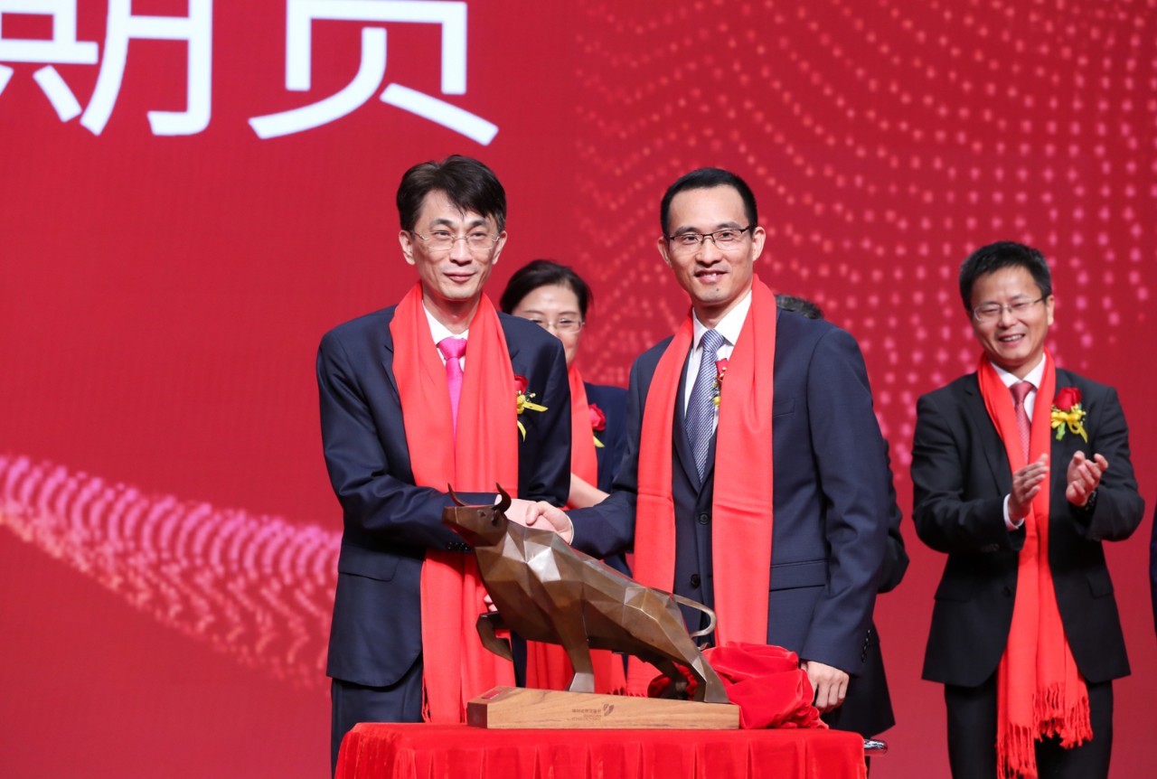 深交所副总经理彭明与瑞达期货董事长林志斌互赠上市纪念礼物。