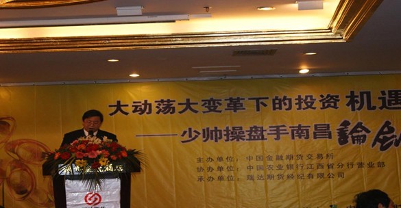 为了帮助广大投资者充分利用金融工具规避股票交易的风险,进一步了解掌握股指期货专业知识及投资技巧,提高投资者的对冲风险能力,瑞达期货经纪有限公司携手中国金融期货交易所及中国农业银行联合举办以“大动荡大变革下的投资机遇与挑战--少帅操盘手南昌论剑”为主题的财富论坛交流会。此次报告会旨在分析当前经济形势对大盘走势的影响及如何利用股指期货锁定股市波动风险,同时也是开展对VIP客户的增值服务以及拓展农业银行银期业务的良好方式。会议于2012年2月25日下午成功落下帷幕。