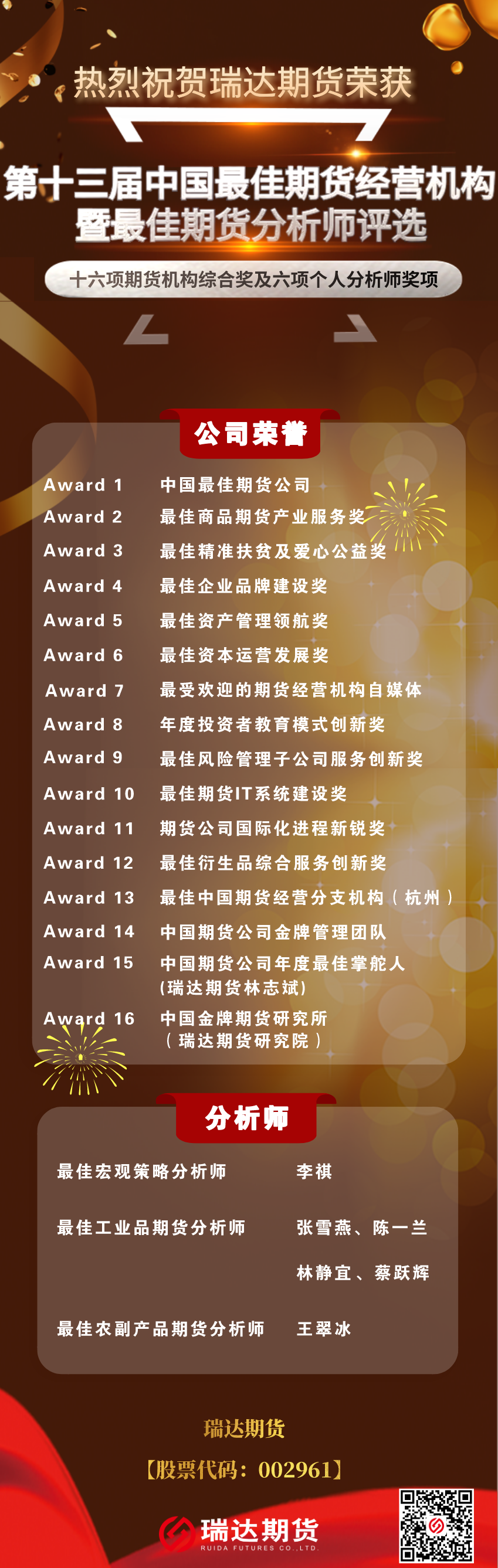 在本次评选中,瑞达期货有幸获得了16项公司大奖,6项分析师大奖。