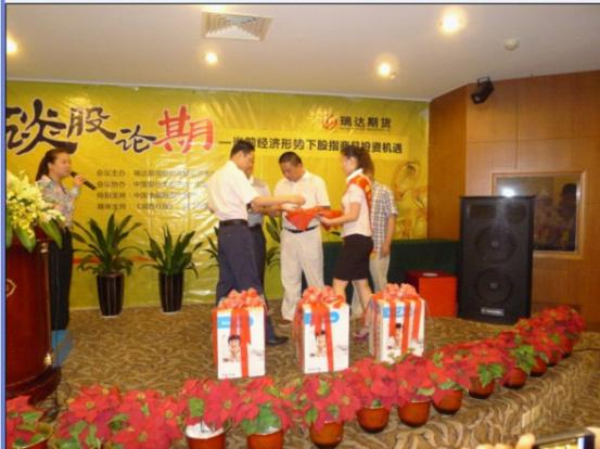 感谢三位讲师的激情分享,借由他们专业、理性的讲解,让我们更加了解了股指、商品、及其他投资理财产品在市场管理中的应用。会议的最后,由瑞达期货龙岩营业部总经理饶蔚先生为我们抽出今天的幸运来宾,送出精美大奖。同时也希望和中国银行、华福证券一起通过三方的强强合作,为您打开一扇通往财富的大门。
