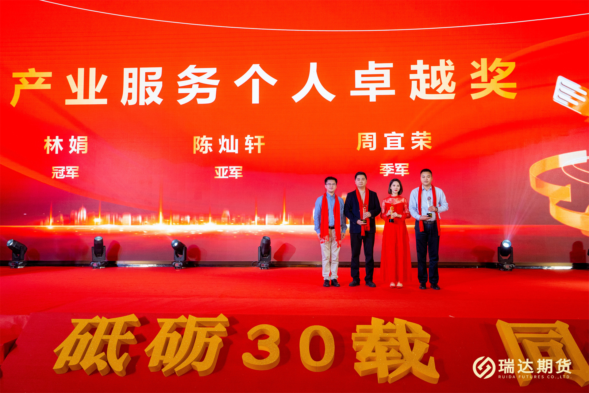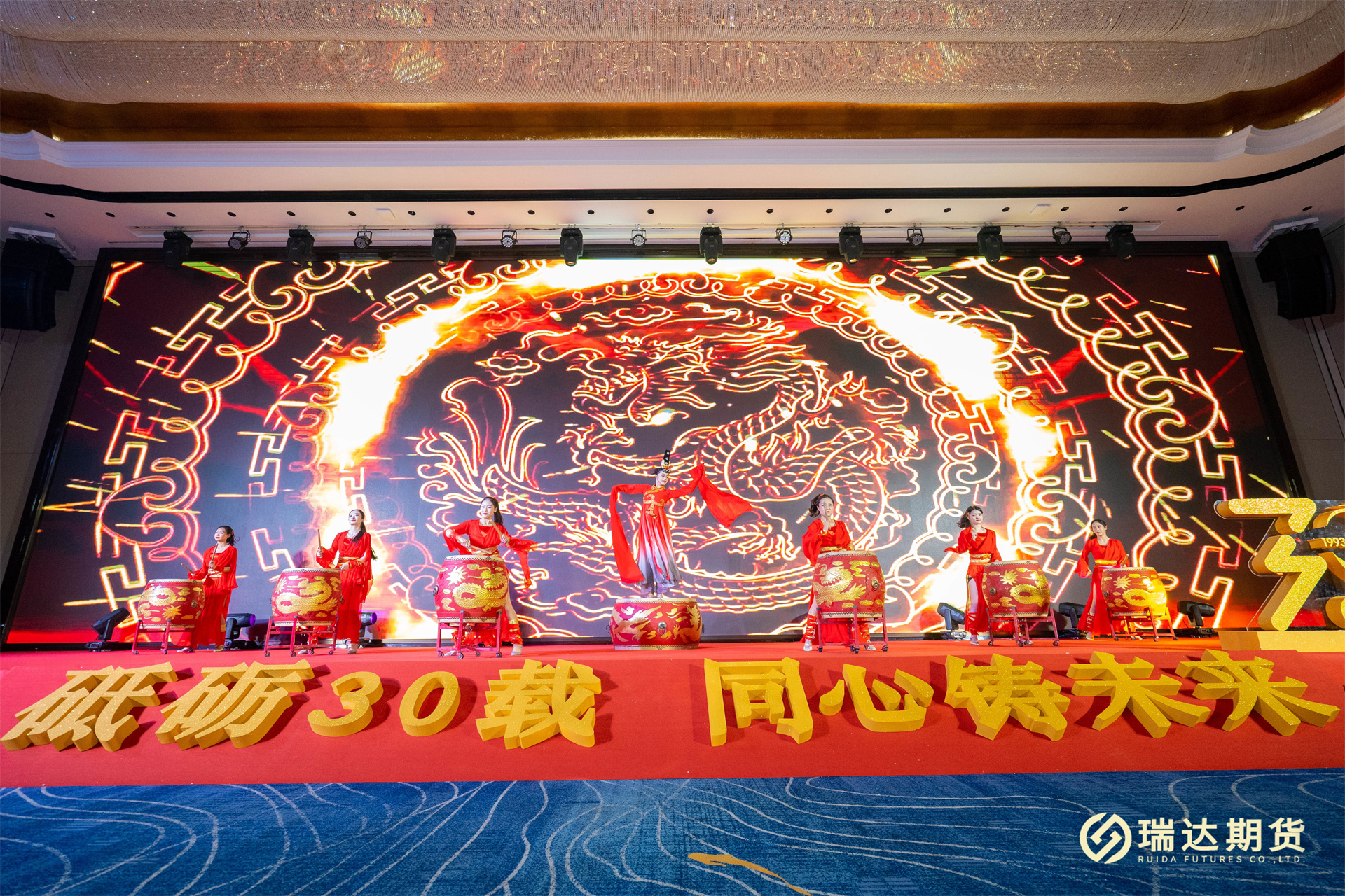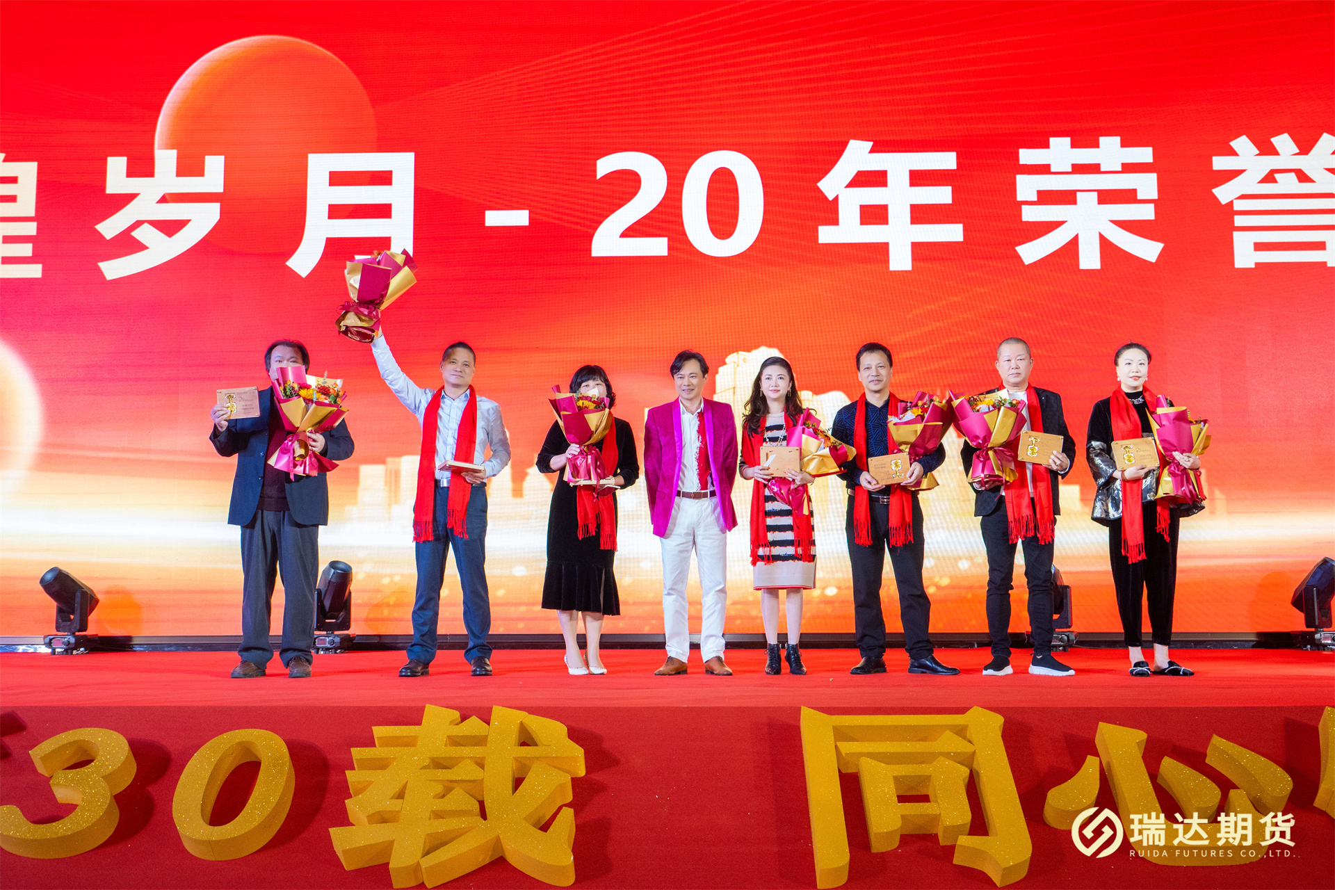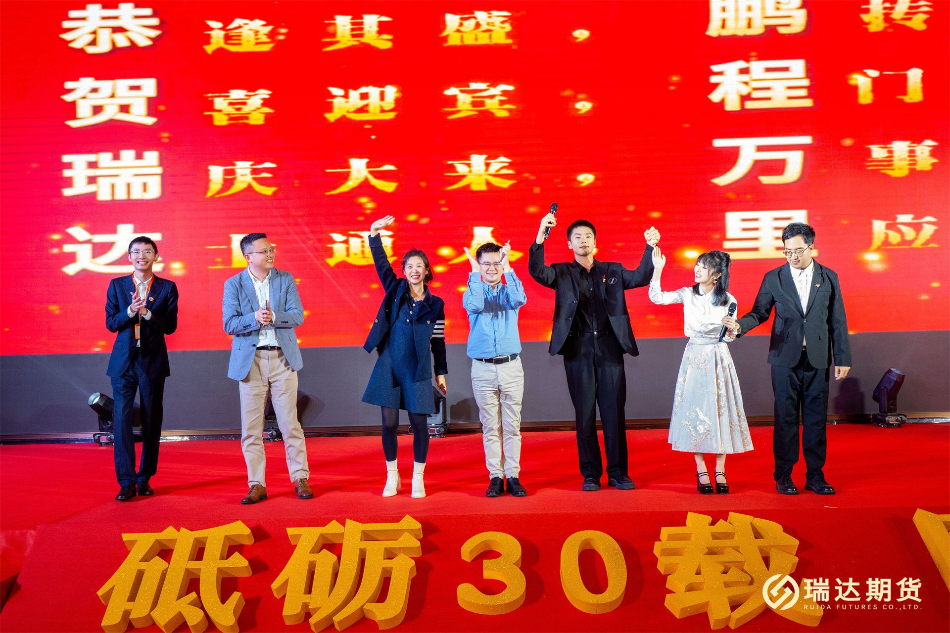 砥砺30载,同心铸未来。2023年12月31日晚,瑞达期货股份有限公司成立三十周年庆典活动隆重举行。公司董事长林志斌、股东代表、受邀嘉宾、客户代表与瑞达期货母公司、子公司员工欢聚一堂,共同回顾瑞达30年的发展历程,共享瑞达30华诞的喜悦。
