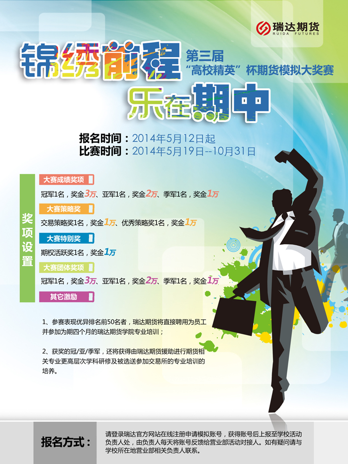 为继续深入与更大高校的长期战略合作关系,积极推动期权的普及与教育工作,同时配合由中国金融期货交易所、中国期货业协会主办的第一届“中金所杯”全国高校大学生金融期货及衍生品知识竞赛,现与全国高校联合举办瑞达期货第三期“锦绣前程,乐在期中”全国高校期权期货模拟大赛。