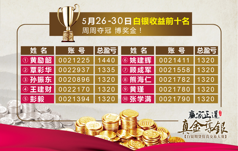 由瑞达期货股份有限公司举办的“赢家正道.真金夺银”白银期货仿真交易大赛,大获好评。本次大赛已有200多名的幸运账户强势出炉,并有4名实力战将登上周冠军的宝座!参赛者热情高涨,应广大投资者的要求,瑞达期货决定将原定于6月6日结束的比赛,延期至7月4日,报名时间延期到6月27日。“真”金夺银势不可挡!每天依旧10个幸运账号抽不停,每周千元大奖送冠军!