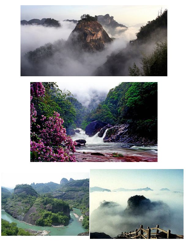 景点:天游峰、九曲溪、虎啸八景、朱熹纪念馆、龙川大峡谷、青龙瀑布、一线天、武夷宫、水帘洞、大红袍景观、仿古宋街等。