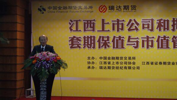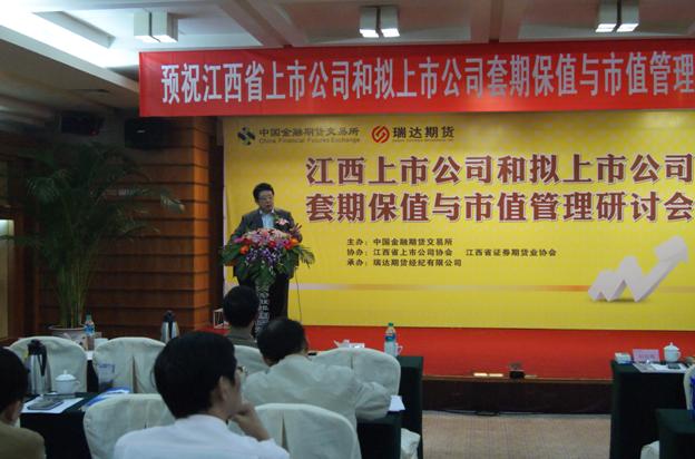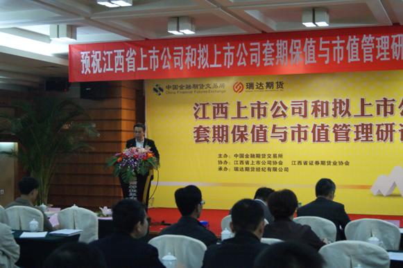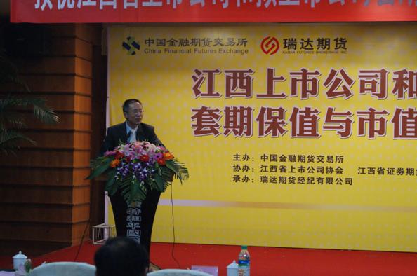 为推动江西上市公司和拟上市公司了解期货市场功能、利用套期保值手段规避市场风险,进一步发挥期货市场服务产业客户的作用,同时引导上市公司做好市值管理工作,由中国金融期货交易所主办,江西省上市公司协会、江西省证券期货业协会协办,瑞达期货经纪有限公司承办“江西省上市公司和拟上市公司套期保值与市值管理研讨会” 于2011年10月26日在江西南昌成功举行。