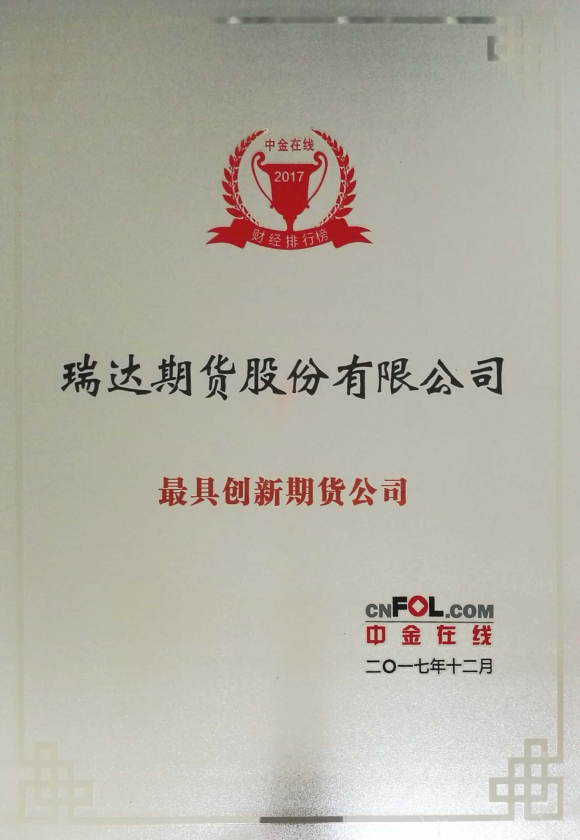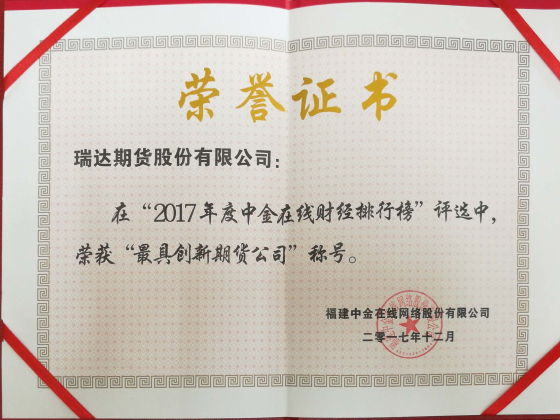 2018年3月26日,中金在线2017年度财经排行榜颁奖典礼在福州隆重召开。瑞达期货以较高的网络人气以及过硬的综合实力,荣获“最具创新期货公司”称号。