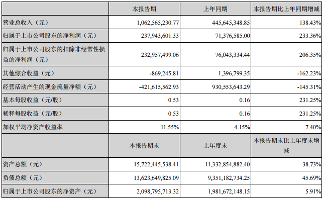昨日晚间,A股上市期货公司瑞达期货披露了2021年半年报。半年报显示,报告期内,瑞达期货实现营业总收入10.63亿元,上年同期为4.56亿元,同比增长了138.43%;实现归属于上市公司股东的净利润2.38亿元,上年同期为7137.66万元,同比增长了233.36%;基本每股收益盈利0.53元,去年同期为0.16元,较去年同期增加了231.25%。