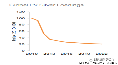 尽管太阳能将在全球发电中占据越来越大的份额,但随着双面打印工艺的持续进步、晶片厚度变薄以及使用其他代替材料等,预计单位光伏电池的白银使用量将继续下降。然而值得注意的是,银的独特导电性能确保了替代材料并不能与使用银的面板输出相等的能量,因此节约银的的过程还将经历很长时间。至少在未来几年内,银有望保持其作为太阳能电池实际金属材料的地位。