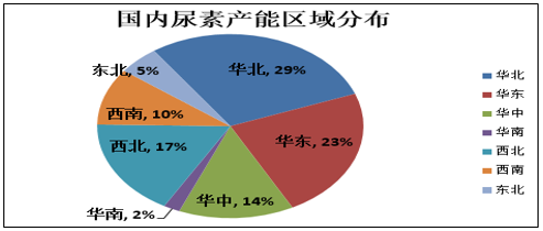 国内尿素地域分布情况来看,尿素的生产主要集中在华东、华北和西北地区,而华南和东北地区的产能较少。华北地区是我国的尿素主产地,国内的焦炉气制尿素主要集中在华北,2017 年华北产能占全国总产能的 29%。其中, 山东、山西、河南为华北地区的尿素主产地。西北地区由于拥有丰富的煤炭和天然气资源,因此尿素的产能占比也较大,凭借着丰富的原料资源优势,新增尿素产能不断释放,西北地区的尿素主产地以新疆、内蒙古为主。西南地区是我国天然气储量最大的地区,因此该地区主要以天然气制尿素工艺为主。西南、华中、华东、东北和华南地区尿素产能分别占全国总产能的 10%、14%、23%、5%和 2% 。省份来看,产能主要集中于山西、山东、河南、新疆和内蒙,2017年该五地产能占全国总产能的54,5%,产能合计约为4237万吨。