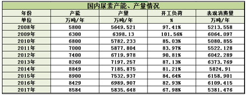 改革开放之后,国内尿素产量出现了扩张的状态,2008年尿素产能达到5800万吨,产量5649.52万吨,开工负荷97.41%。在技术发展驱动下,2015年国内产能达到顶峰8900万吨,相较于2008年增幅53.44%;产量7532.93万吨,开工负荷84.64%。不过,随着供应大幅增加,市场需求跟进有限,国内尿素呈现供过于求的状态。2016年以来国内环保淘汰落后产能政策,经济效应较差的中小型企业及污染较为严重的尿素装置被逐渐淘汰,2017年产能降至8584万吨,产量5835.64万吨,开工负荷67.98%。未来随着化肥行业的结构调整和行业自身的发展状况,尿素企业呈现大型化、集团化的态势。