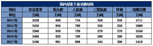 我国是世界传统农业大国、全球最大的化肥消费国,同时也是全球最大的尿素生产国和消费国。目前我国的尿素消费量占全球尿素总消费量的1/3左右。2017年,我国尿素的表观消费量为5381.476万吨/年,由于我国的耕地面积呈现缓慢下降及农业技术的发展,2013年表观消费量达6373.77万吨/年之后开始逐步呈现下滑的态势。