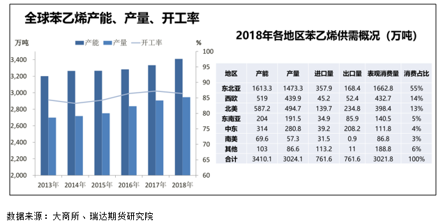 2018年全球苯乙烯产能为3410.1万吨/年,产量为3024.1万吨,装置开工率为 88.7%。2013年-2018年,全球产能、产量和需求的年均增速分别为 1.2%、2.1%和 2.1%,装置开工率提高了4个百分点。