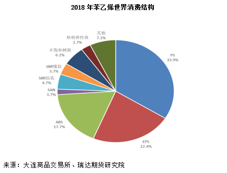 EPS 是目前苯乙烯第二大下游衍生物,2018 年用于该用途的苯乙烯量占总消费量的 22.4%。EPS 主要用于建筑保温材料和保温包装材料,下游消费结构相对单一,增长主要与房地产及冷链包装行业相关。2013年-2018年均增长率为2.53%。