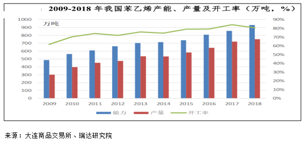 近年来由于下游需求旺盛,我国苯乙烯产能产量持续增长。我国苯乙烯生产能力从2009年487万吨/年增长到 2018年的926万吨/年,产量从300万吨增长到768万吨,年均增长率分别为9.8%和13.3%,装置平均开工率从61%提升到80.6%。