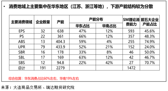 截止2018年,国内共有44家苯乙烯生产厂家、52条生产线,总产能921.7万吨。较2017年相比2018年新增安海湾化学50万吨、安徽昊源26万吨装置。我国产能占全球27%,我国苯乙烯产销及进口均集中在华东、华南地区,其中华东是最大的产销地,同时也是最大的进口及贸易集散地。华东产能占比达45%,华北占比22.4%。十三五期间,我国有序推进国内民营炼化一体化项目,目前国内已有恒力、浙石化、盛虹、旭阳石化等7大千万级炼化一体化项目获批进入建设高峰期。国内大炼化企业大多配套下游苯乙烯装置。除了民营炼化装置,前两年苯乙烯的高利润下也吸引部分企业增加对苯乙烯产能的投放,粗略估计19-20年我国计划新增的苯乙烯产能约600万吨,近几年我国将迎来苯乙烯产能井喷期。