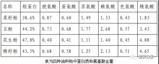 1.蛋白质。菜籽粕的主要营养成分为蛋白质,是一种重要的饲料蛋白原料。一般菜籽粕粗蛋白含量在 35-40%。菜籽蛋白氨基酸组成较平衡,几乎不存在限制性氨基酸。菜籽蛋白效价为 3—5,比大豆蛋白还高。与其它油料粕相比,菜籽粕中的含硫氨基酸含量最高,其次蛋氨酸、赖氨酸含量也较高。下表为菜籽粕、豆粕、花生粕和棉籽粕中蛋白质和主要氨基酸含量。