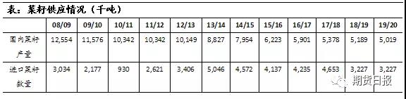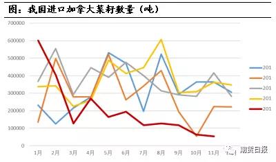 据了解,2019/2020年度国内菜粕供应量下降,进口菜籽大幅减少是主因。受中加关系影响,去年3月份以来菜籽进口量大幅下降,2019年1-11月我国累计进口菜籽259万吨,较去年同期的442万吨大幅减少183万吨,减幅41.4%。受中加关系变化的影响,3月份以来我国菜籽进口量一直保持较低水平。预计2019年全年菜籽进口量在275万—280万吨,较2018年的476万吨进口量大幅减少200万吨左右。