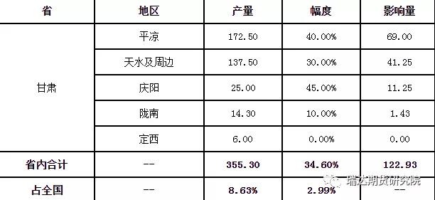 从季节性看,每年富士苹果5、6月价格环比一季度价格有明显上涨,主要造成的原因如下:1、由于苹果树在清明节附近开花,5月之后坐果、套袋等阶段,这期间北方地区在4月附近适逢寒潮天气,一旦低温持续时间够长,将对苹果花造成一定的损害,从而导致苹果减产,2018年度苹果减产就是这个原因造成;而今年苹果开花时间相对去年后移,避过寒潮损害,但坐果阶段的果子也亦受低温影响,出现掉落、损害等影响,最终也会导致新季坐果率的下降,亦对新季苹果产量的变化产生一定的炒作作用。自今年5月以来苹果部分产区出现冰雹,再次对新季苹果价格形成支撑。值得注意的是,新季苹果产量不确定的情况下,天气、资金等因素均利好于远月苹果合约。2、水果之间的季节性相对明显,5月初西瓜、荔枝等上市规模相对不大,价格相对偏高。3、5、6月份期间全国大部分地区阴雨天气居多,运输及存储成本上升,易带动水果整体价格上涨。据全国农产品批发市场价格信息系统监测,截止上周(5.1-5.9)重点监测的5种水果平均价格为6.51元/公斤,环比上涨0.9%,同比下降7.7%,水果之间价格变化明显。随着时间推移,6月之后,大多数水果成熟,时令鲜果上市规模加大,市场消费者可选择性加大,且较初期尝鲜度偏好下降,价格随之下滑。即便是在2018年减产的背景下,苹果价格也难逃季节性下跌的趋势。新季苹果产量的变化,将直接导致后市“苹果自由”是否可以到来。今年坐果时期,部分产区受冻害影响,各路机构前往产区调研,观点各不一,加之各类减产视频等加速苹果价格上涨;据卓创知,西部产区前期受低温冻害范围比18年小,多数地区冻害减产情况仍处于不确定的状态。由于坐果受冻害面积主要分布在西部地区,以下主要以陕西及甘肃产地来预测苹果产量影响预测。以下图为甘肃省各地新季苹果受冻情况:(单位:万吨)