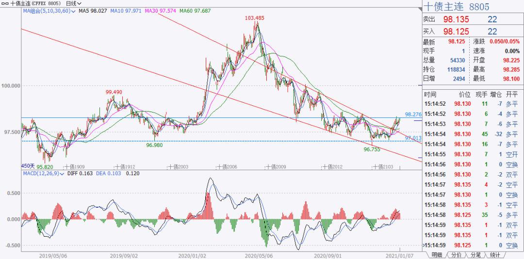 图4:T2103合约正在测试几个月箱体震荡形态的上限