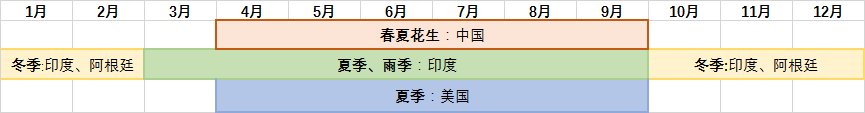 花生是喜温作物,在北半球种植周期主要集中在3-9月份,在南半球种植周期主要集中在10月-次年2月。我国花生主要种植收获期在4-9月份。美国花生受霜期影响播种期稍微延后,在4月或5月最后一个霜期后种植,8-9月份收获。因地处热带和亚热带半干旱地区,印度花生一年四季均可生长,主要种植收获期集中在6-9月份的雨季,同时旱(夏)、凉(冬)季花生只要水分供应充足也可种植。阿根廷花生种植期集中在10-次年2月份,收获期在3-5月份。