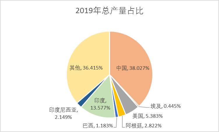 播种面积方面,全球花生种植面积近年来呈现上升态势。2019/2020年度,印度是世界第一大花生种植国,中国占据第二大花生种植国,其次是美国。据美国农业部数据显示,2019/2020年全球花生种植面积为27171千公顷。其中印度花生种植面积为4880千公顷(占比17.96%),中国为4600千公顷(占比16.93%),美国为562千公顷 (占比2.068%),印度尼西亚550千公顷(占比2.024%),阿根廷为368千公顷(占比1.354%),巴西为157千公顷(占比0.578%)。总产量方面,全球花生产量呈现逐年增加态势。2018年全球花生产量达到峰值,2019/2020年开始下降,主要原因是2019/2020年阿根廷和印尼生产量下降。据USDA数据显示,2019年全球花生总产量为46072千吨,较2018年47092千吨下降2.167%。中国是全球最大的花生生产国。2019年,花生产量占全球花生总产量的38.03%,远远高于全球第二大花生主产国印度的产量占比13.58%。除中国和印度以外,其余花生主产国为美国、印度尼西亚、阿根廷和巴西。据USDA数据显示,2019年度中国花生产量为17520千吨(占比38.03%),印度花生产量为6255千吨(占比13.58%),美国花生产量为2480千吨(占比5.38%),阿根廷花生产量为1300千吨(占比2.82%),印度尼西亚花生产量为990千吨(占比2.15%),巴西花生产量为545千吨(占比1.18%)。