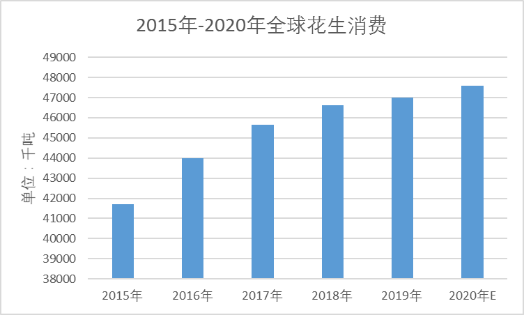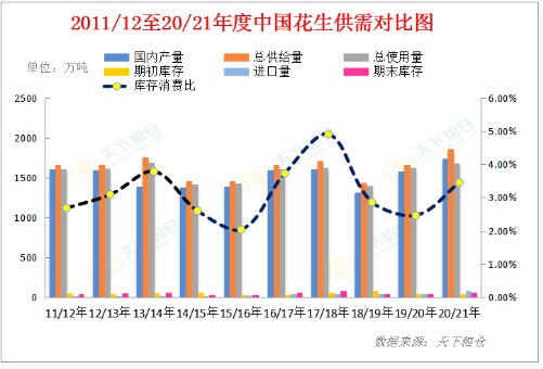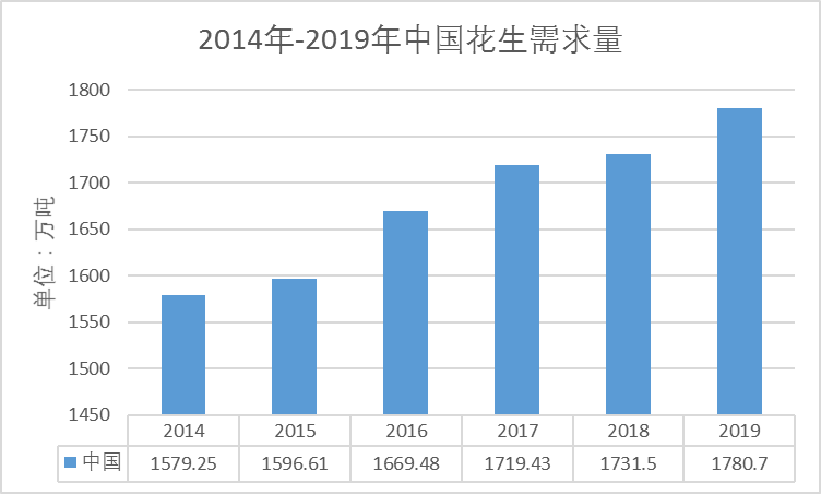 中国不仅是花生的生产大国,也是花生及其制品的消费大国,在全球花生及其制品的进出口贸易中有着举足轻重的位置。花生是中国百姓中用量最大、食用最普遍、消费者最喜爱的干果食品。中国花生食品种类繁多,如各类炒烤花生果,油炸花生米,五香、草香、奶油花生米,咸花生,花生酱,以及琥珀花生、花生酥、花生粘、鱼皮花生等众多花生食品和花生糖果,这些琳琅满目的产品都是中国百姓喜爱的花生食品。2019/20年中国花生需求量1780.7万吨,比2018/19年增加49.2万吨,同比增长2.8%。
