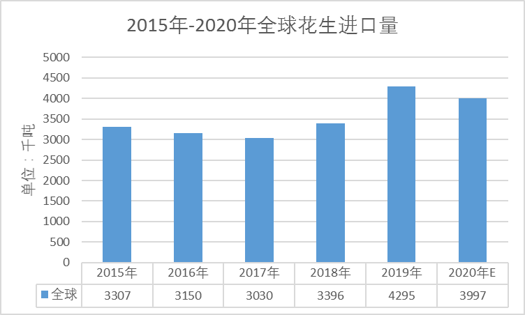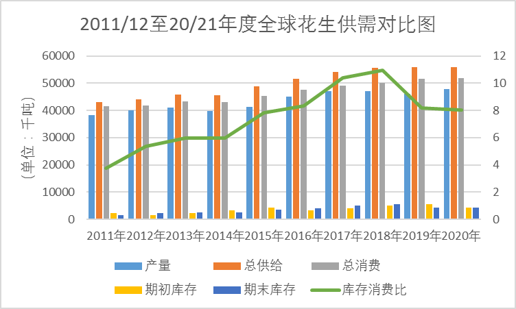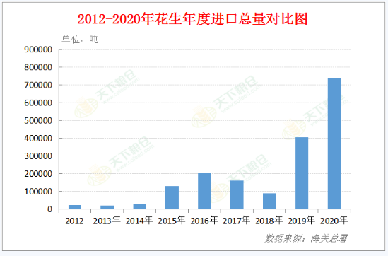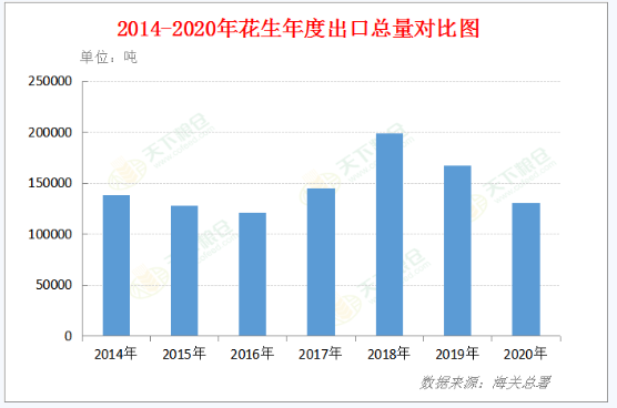 据海关数据显示,2020年1-11月花生出口总量117542.69吨,较2019年1-11月花生出口总量174201.42吨,减少56658.73吨,跌幅为32.52%。往年花生出口量情况:2013/14年134741吨,2014/15年138213吨,2015/16年127663.885吨,2016/17年 121115.489吨,2017/18年145199吨,2018/19年198526.2吨,2019/20年191459.08吨,2020/21年预估130662.84吨。据海关数据显示,2020年1-11月花生进口总量723586.92吨,较2019年1-11月花生进口总量378798.94吨,增加344787.98吨,增幅为91.02%,2020年花生进口总量预估约738689.27吨,较2019年同期进口量的404765.78吨,增加333923.49吨,增幅82.50%。往年国内花生进口量情况:2014/15年29886.526吨,2015/16年132182.957吨,2016/17年206468.697吨,2017/18年162632吨,2018/19年88659.58吨2019/20年404765.78吨,2020/21年预估738689.27吨。